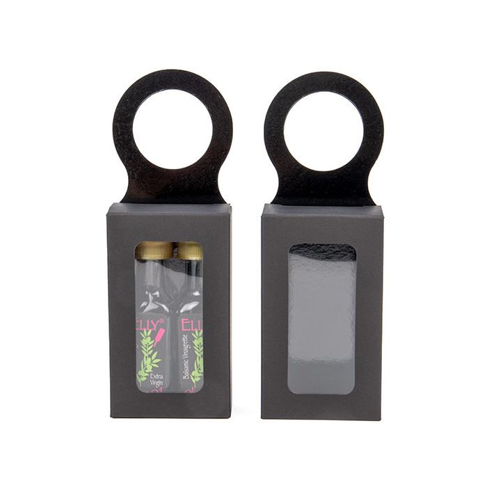 Measuring 5,5 x 3 x 10 cm, this black wine bottle box is ideal for pairing items. Simply fill this box With small gifts, treats, chocolates and more and then hang around the neck of a bottle. This box is made from sturdy 350 gsm paper and lined With PET making it food safe. The attached hanger features a 3,8 cm round hole to easily slide onto the neck of most wine, olive oil or port bottles.
